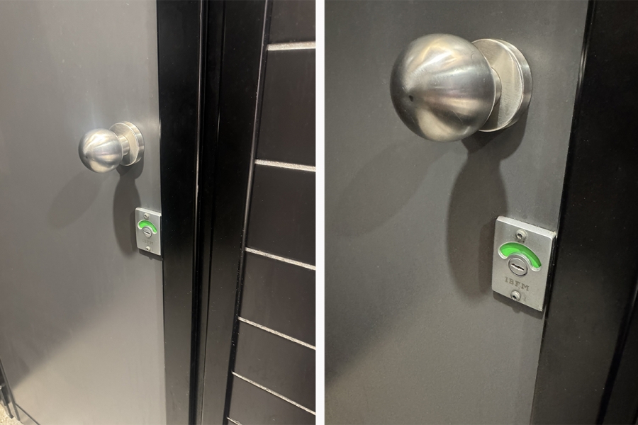 Rotative bolt "Vacant-Engaged" without key. Can be used a screwdriver in order to open the bolt even from outside in case of emergency.