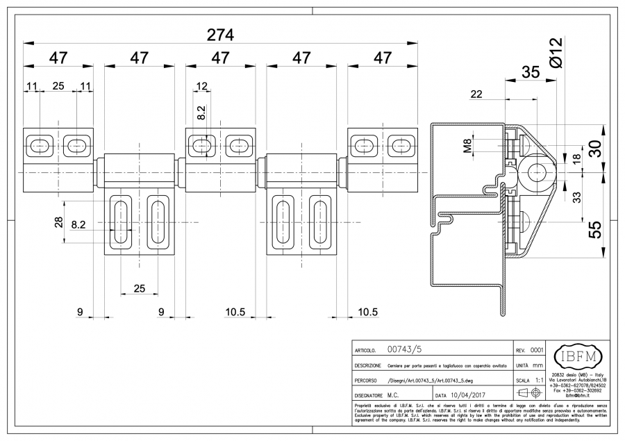 Heavy duty, 3D regulating hinge with ball bearings suitable for many different profiles. This hinge is Suitable to be installed on heavy doors, security doors, entrance doors, fire, and smoke-proof doors. The installation process is easy, intuitive and could be performed entirely in front of the closed door. The installation is performed thanks to M8 screws, counter plates and eventually rivet nuts (not included). Thanks to its strong construction, this hinge could be used to operate extra heavy metal gates, openings, or door leaves.