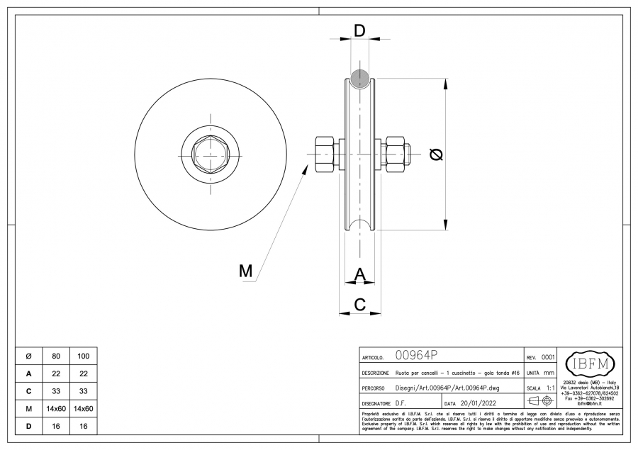 Metal wheel with 1 ball bearing and round groove Ø 20mm to be screwed, suitable for heavy metal gates. This product by rotating allows the opening of gates operated manually or by electric engines. Consider to match the shape of the groove with the shape of the track in order to obtain a durable functioning and a not excessive consumption of the elements themselves.
