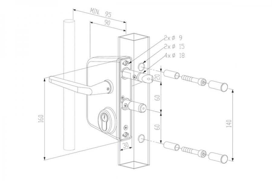 Locks for square or round or rectangular profile adjustable for mm 40/50/60, complete with handle and cylinder with 3 keys and reversible