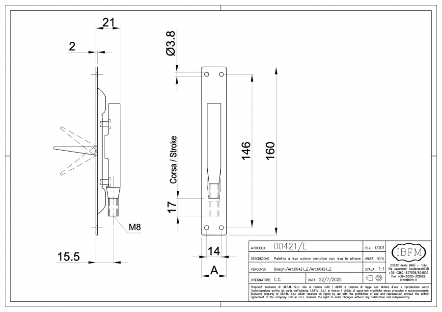 In order to lock both upwards and downwards it is possible to use 2 pcs of the same flush bolt simultaneously. The distance of application of the flush bolt depends on the length of the applied threated bars (for example Art. 420/A). Another accessory widely used with these flush bolts are female metal caps (for example Art. 420/C) or male metal caps to be installed directly on the flush bolt (for example Art. 420/CP). Their role is to match the hole prepared in the frame in order to assure the locking. In order to complete the assembly correctly the position of the flush bolt should be determined after the installation of the threatened bar and the cap.