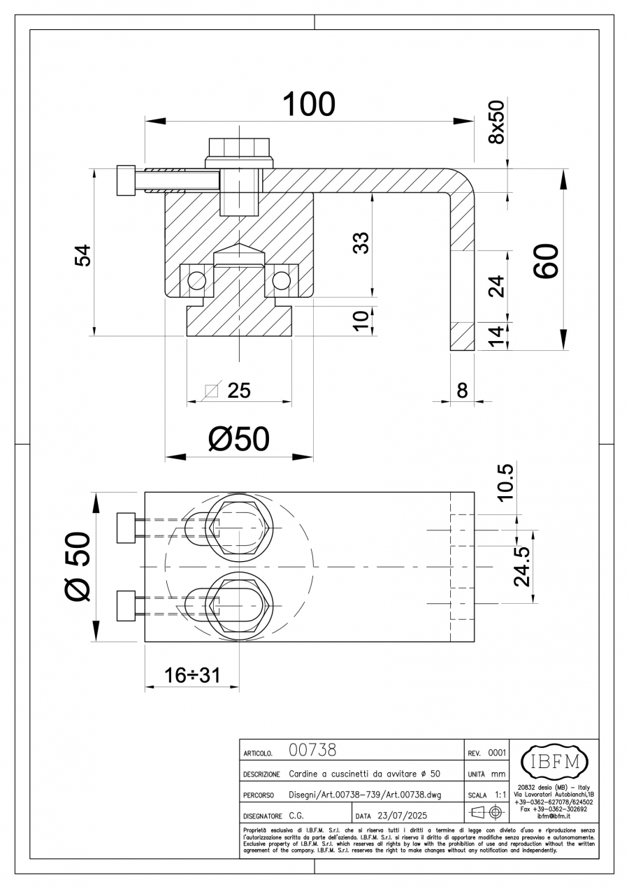 This product is suitable to be screwed to the upper part of the frame profile and welded on the door and allows, through screws, the horizontal and vertical regulation of the door leaf in the upper part.