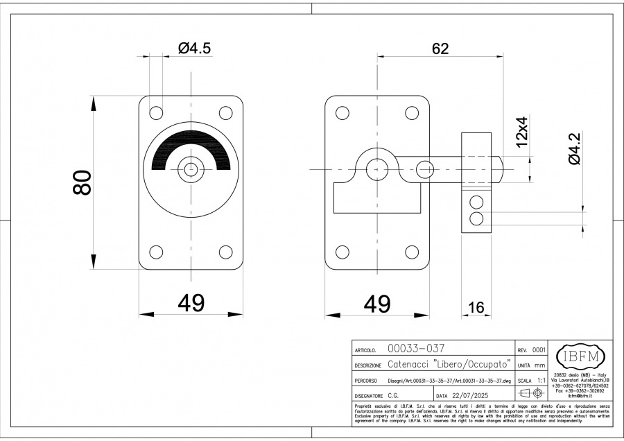 Sliding bolt "Vacant-Engaged" with key to be opened even from outside in case of emergency.
