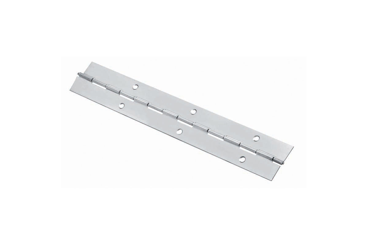Steel piano hinge suitable to be screwed on light wooden leaves and furniture.