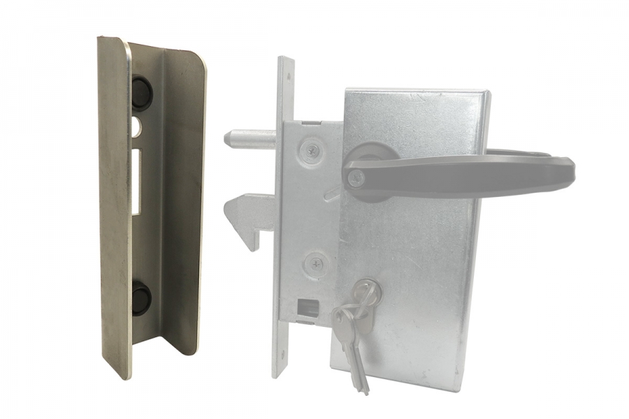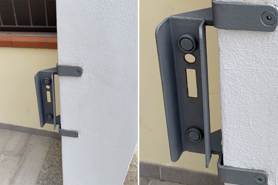 Staple for Hook Lock suitable for sliding gates with or without security lock, equipped with rubber pads to cushion the impact of the sliding door.